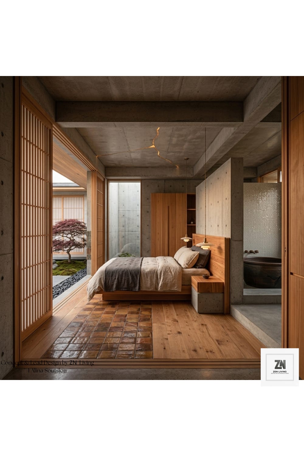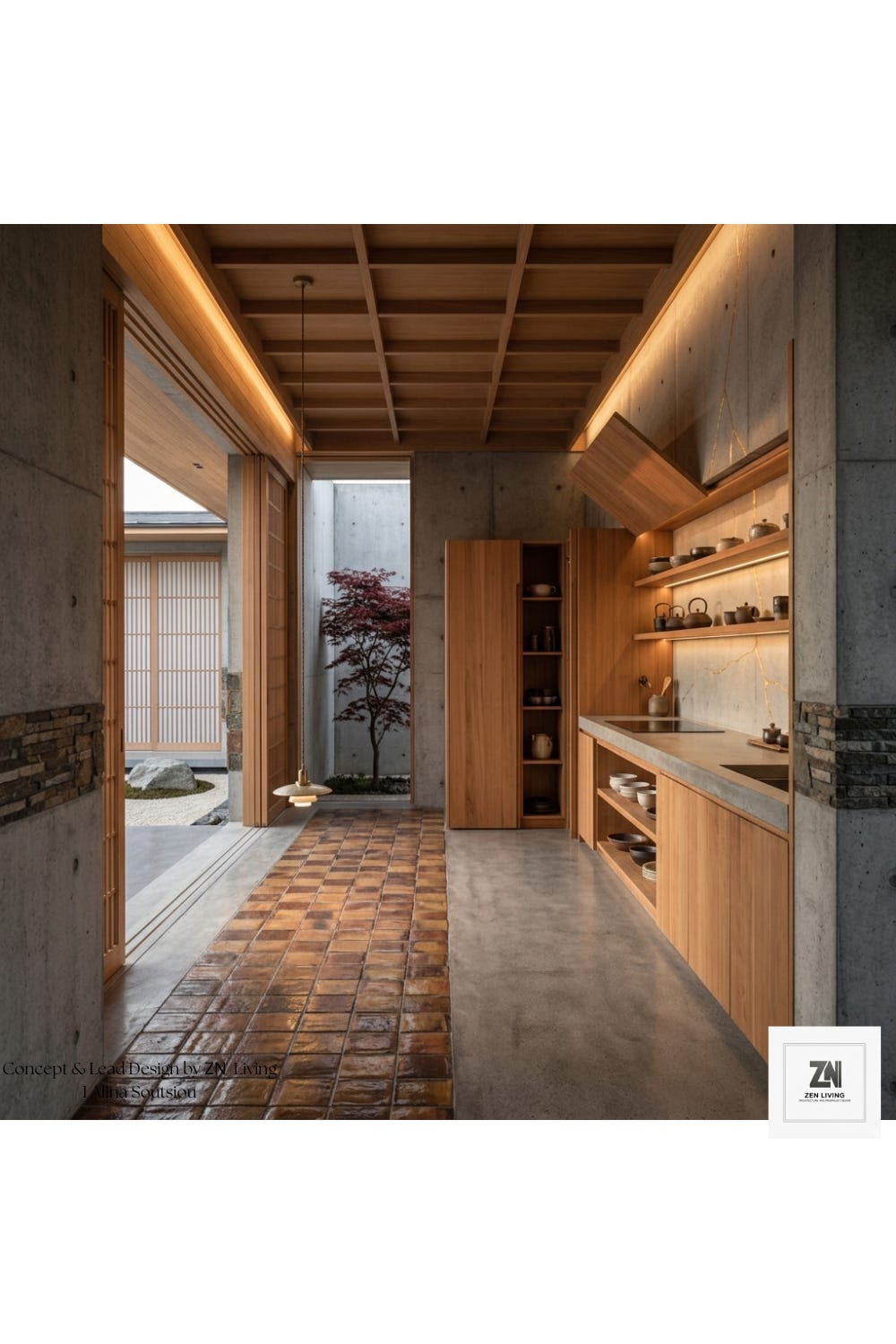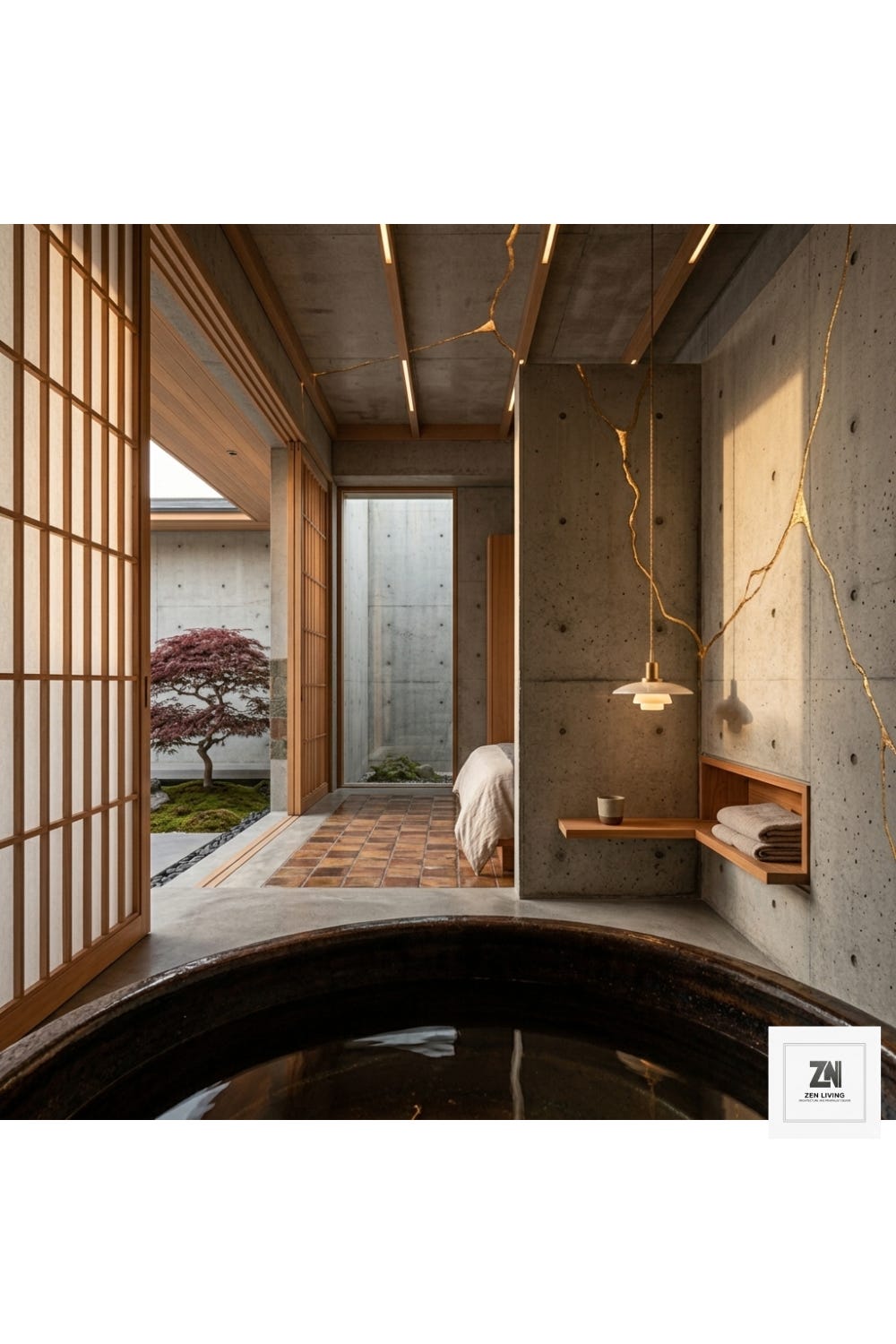 At the heart of the home lies the Lumen Atrium, a space where architecture serves as an environmental engine. Here, the living area feels weightless. We’ve designed a kitchen that eschews bulky cabinetry, favoring floating elements that allow light to permeate every corner. The floor, a sophisticated blend of terracotta tiles, is mapped with those signature gold-resin lines, which seem to "mend" the floor into a cohesive, artistic landscape. It is here that the house breathes, with light filtering through to illuminate the textures of the cedar wood and raw concrete.