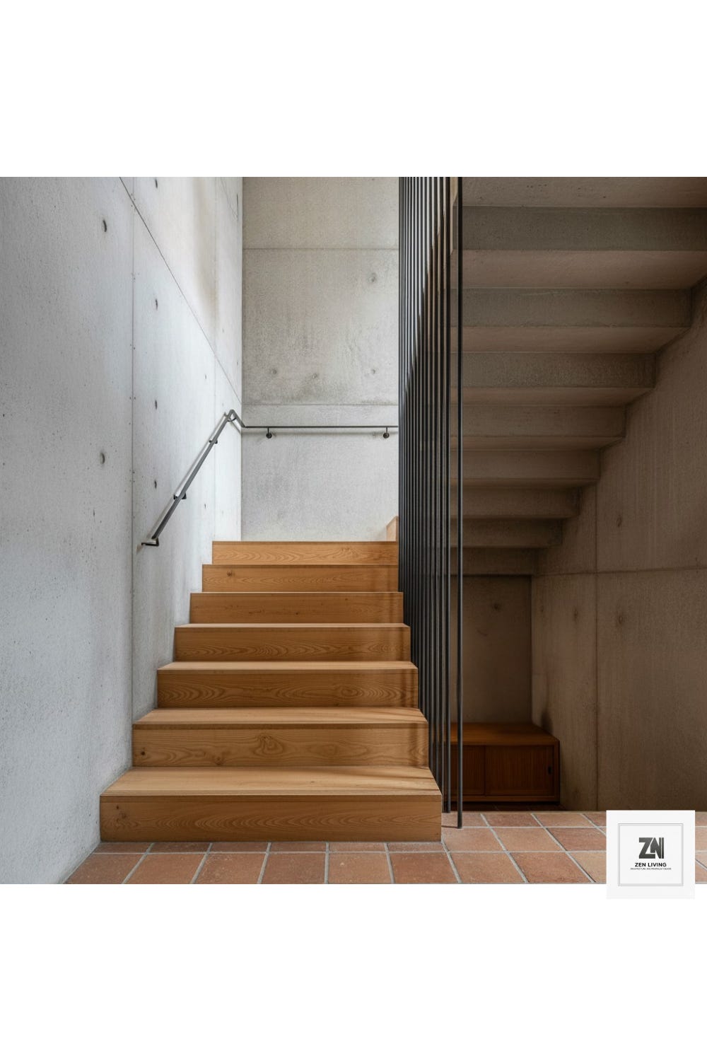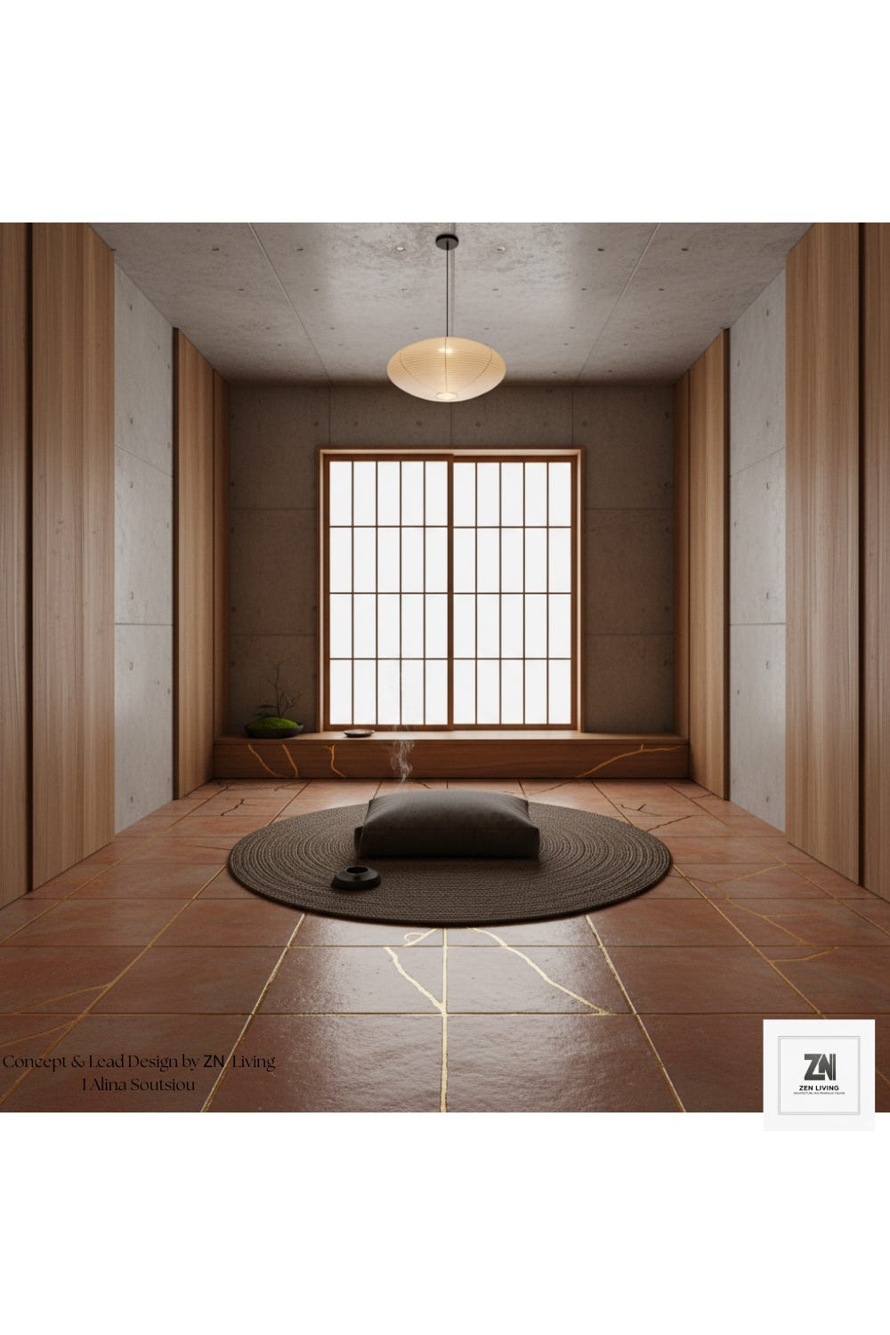 Moving into the private wings, the Meditation Room stands as a testament to Wabi-Sabi. The room is a vessel for focus: clean, linear, and utterly quiet. A single shoji-inspired window provides diffused, milky light that dances on the textured concrete walls. In the center, a simple woven mat and a single cushion invite deep meditation, while the floor remains consistent with the rest of the home—a grounding, earthy terracotta that bridges the gap between the internal peace of the room and the rugged reality of the structure.