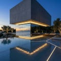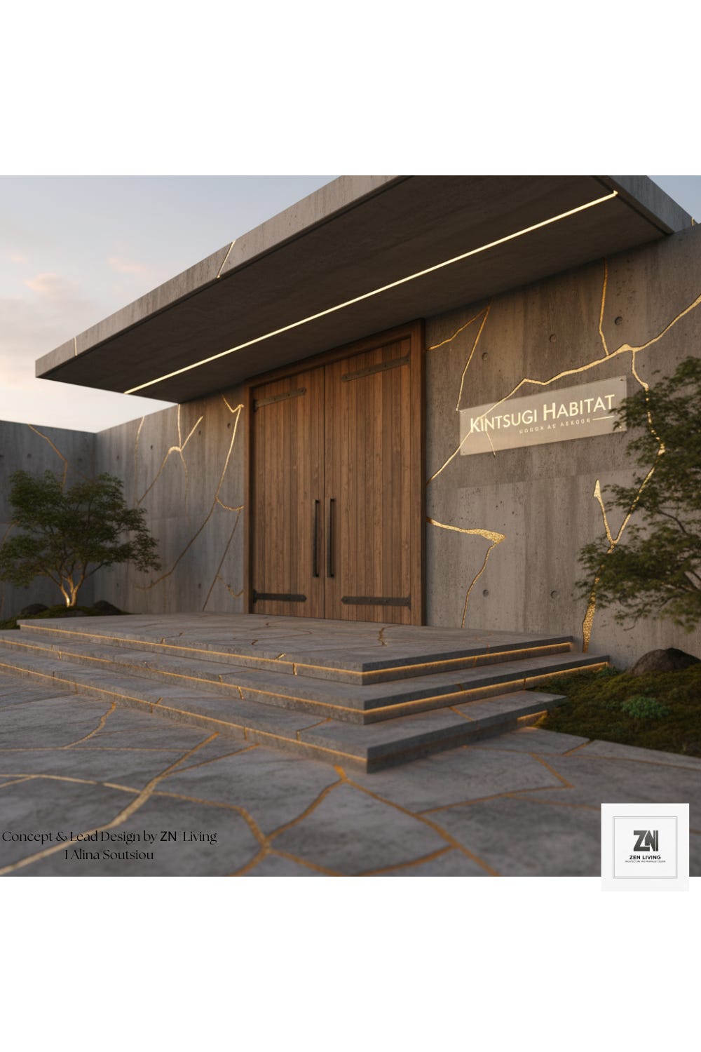 The journey into the Kintsugi Habitat begins at a threshold that defies traditional architecture. The entrance facade is a monolithic expression of raw, structural concrete, sliced by golden, illuminated veins—a physical manifestation of the Kintsugi philosophy. A massive, warm-toned timber door acts as the soul of the facade, creating a tactile contrast against the cool, industrial stone. As you ascend the concrete steps, the subtle glow of integrated lighting follows the golden paths, guiding you not just into a home, but into a space of intentional transition.