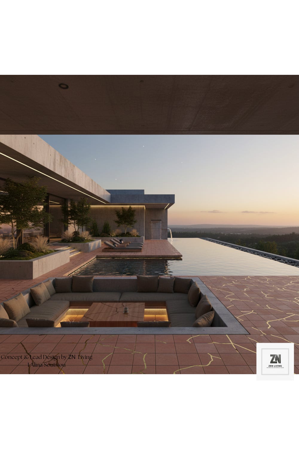 Finally, the outdoor lounge serves as an extension of the interior. A sunken seating area carved directly into the deck puts you at water level with the infinity pool, which visually spills over into the horizon. The terracotta flooring, adorned with gold, continues from the interior out to the pool edge, blurring the boundaries between inside and outside. As the sun sets, the pool reflects the warm, golden hues of the home, creating a sanctuary that feels as though it has been carved from the landscape itself.