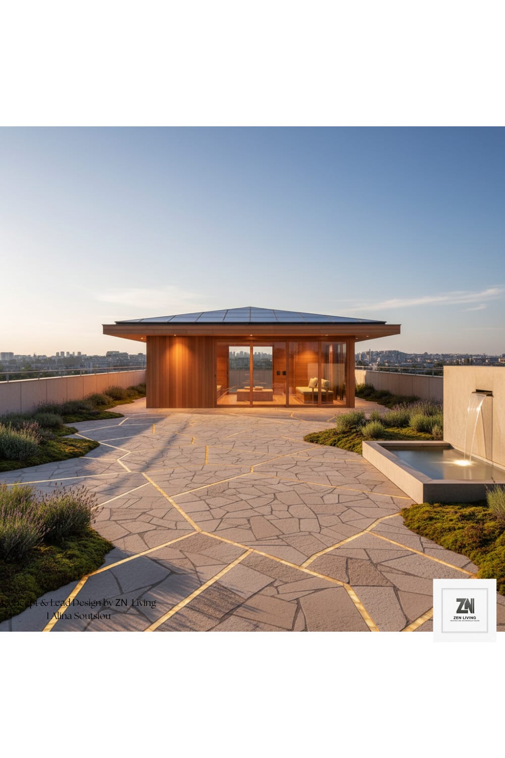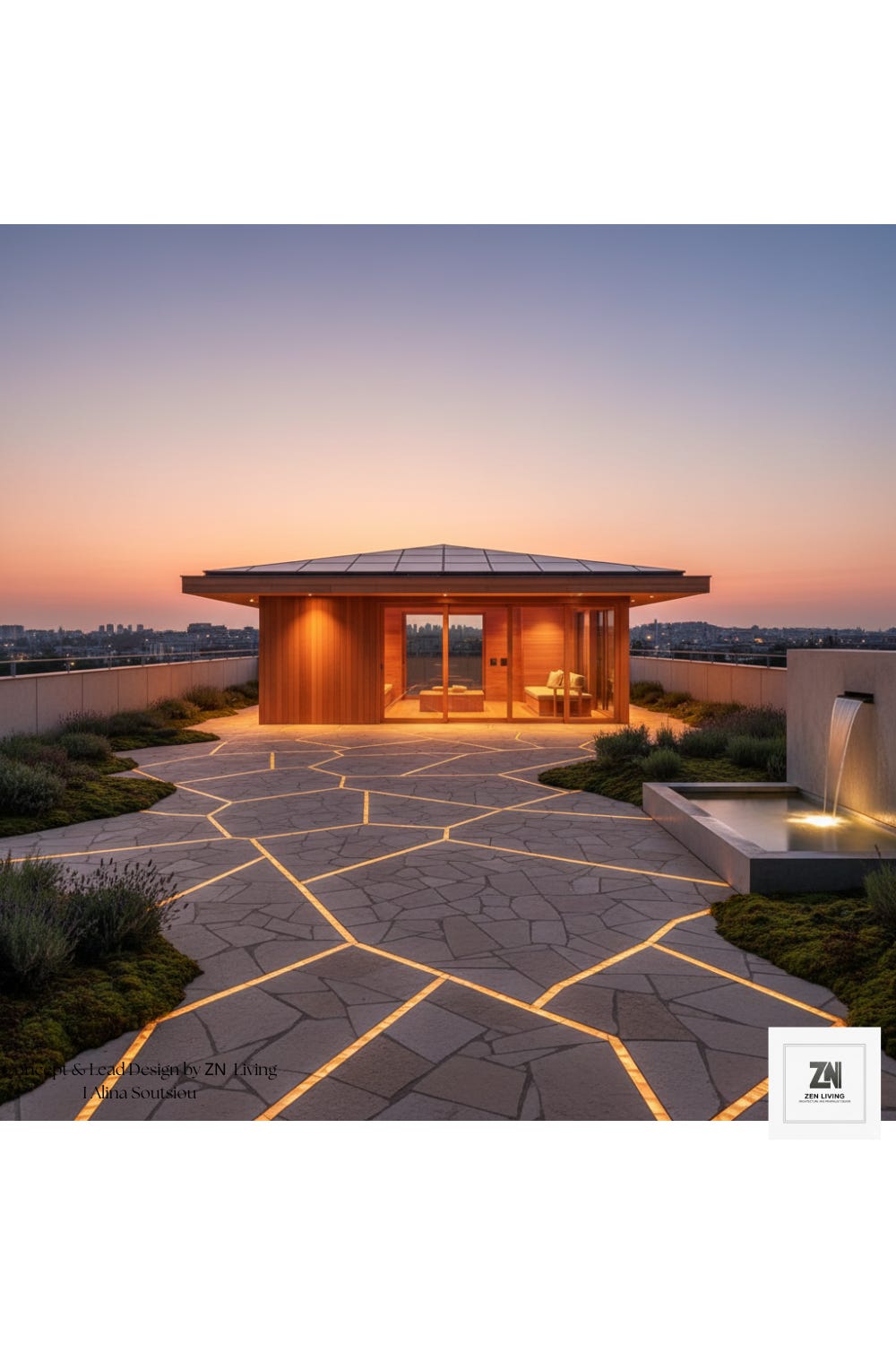 Ascending to the summit, the rooftop is where technology meets tranquility. The Sky-Garden features transparent, solar-integrated ceramic tiles that mimic the traditional Japanese kawara aesthetic while powering the home. At dusk, the space transforms: the "Kintsugi path"—a stone walkway etched with glowing gold lines—mirrors the constellations above. With a minimal wooden pavilion for star-gazing and a sculptural water feature providing a constant, soothing white noise, the rooftop is the ultimate intersection of sustainable luxury and meditative retreat.